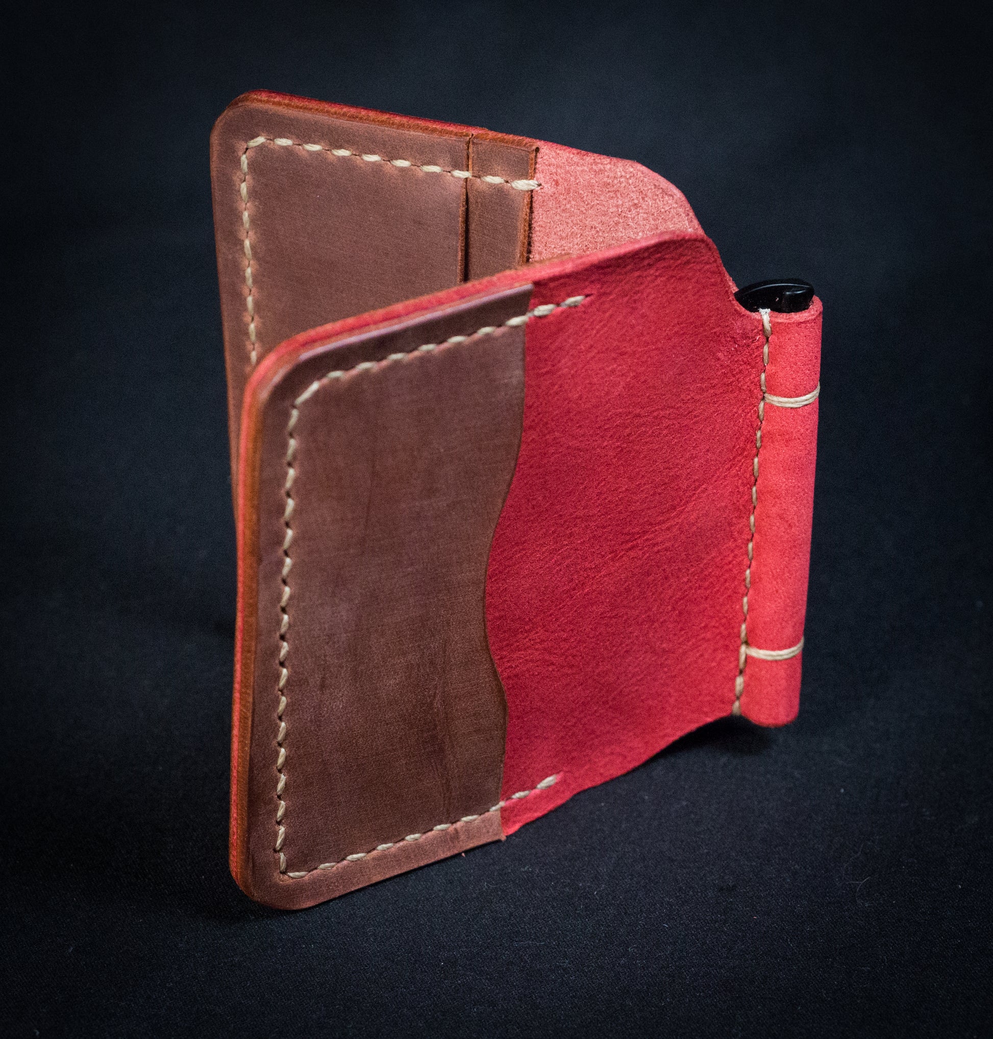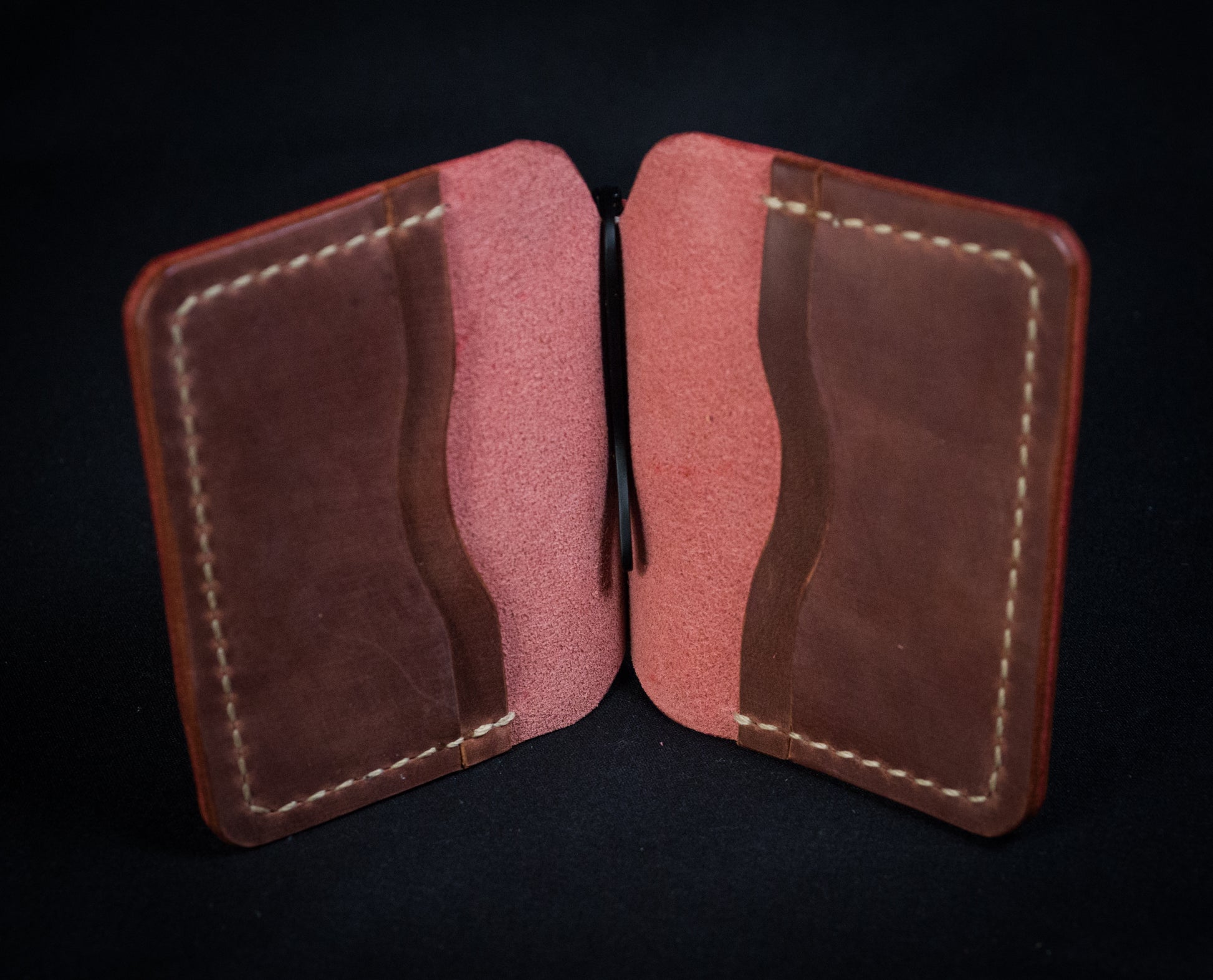 The inside contains another 4 card slots and a solid brass money clip. Each card slot will hold 3-4 cards easily before the leather is broken in. Once you break it in it will hold a lot more!